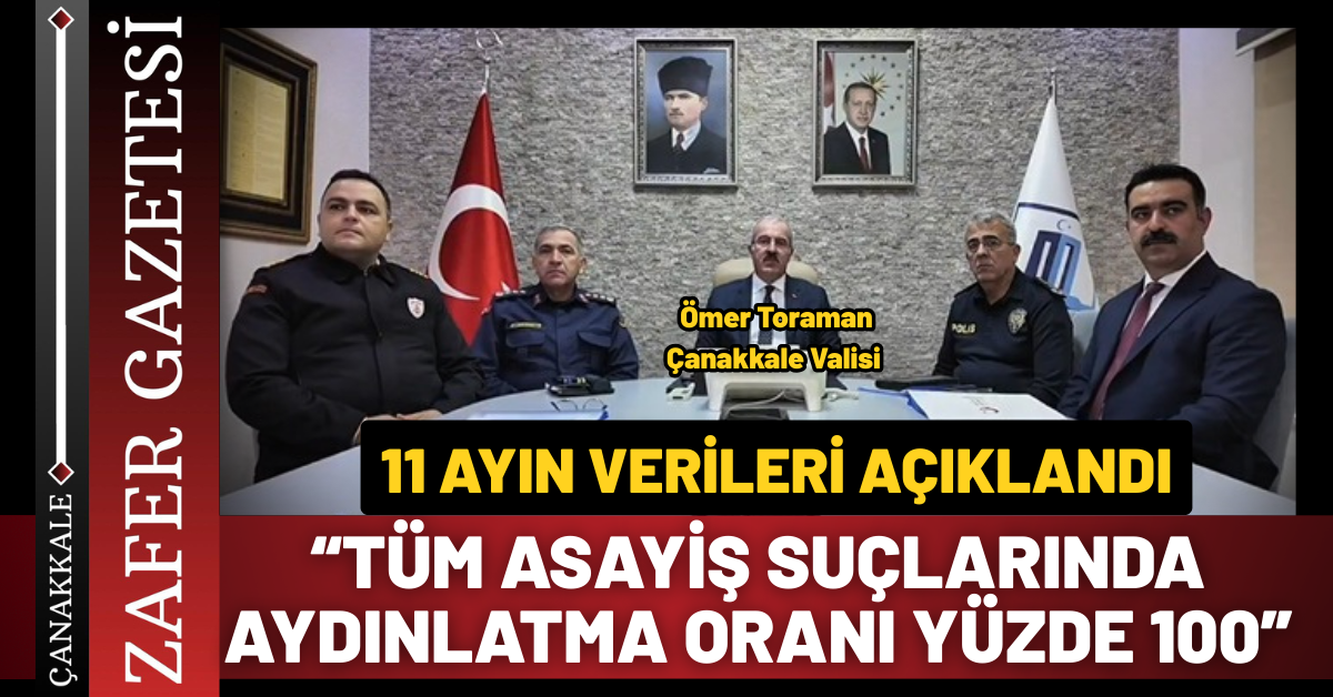 Çanakkale Valisi Doç.Dr. Ömer Toraman beraberinde İl Jandarma Komutanı Kıdemli Albay Cemalettin Akyüz, İl Emniyet Müdürü Ergün Dağıstanlı, Sahil Güvenlik Batı Marmara Grup Komutanı SG. Yarbay Orhan Öğrenci ve İl Göç İdaresi Müdürü Fatih Ahmet Günel ile birlikte 2025 yılının ilk 11 ayına ait emniyet ve asayiş uygulamalarına yönelik verileri kamuoyu ile paylaştı.