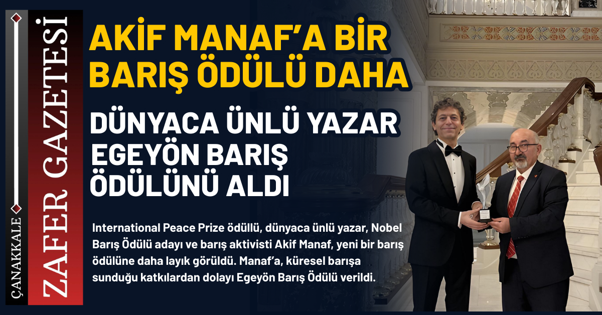 International Peace Prize ödüllü, dünyaca ünlü yazar, Nobel Barış Ödülü adayı ve barış aktivisti Akif Manaf, yeni bir barış ödülüne daha layık görüldü. Manaf’a, küresel barışa sunduğu katkılardan dolayı Egeyön Haber-TV tarafından Egeyön Barış Ödülü verildi.