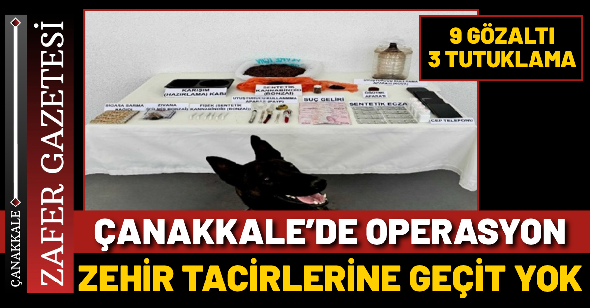 Çanakkale İl Jandarma Komutanlığı ekiplerince düzenlenen uyuşturucu operasyonunda 9 şüpheli gözaltına alınırken, adliyeye sevk edilen 3 kişi tutuklanarak cezaevine gönderildi.