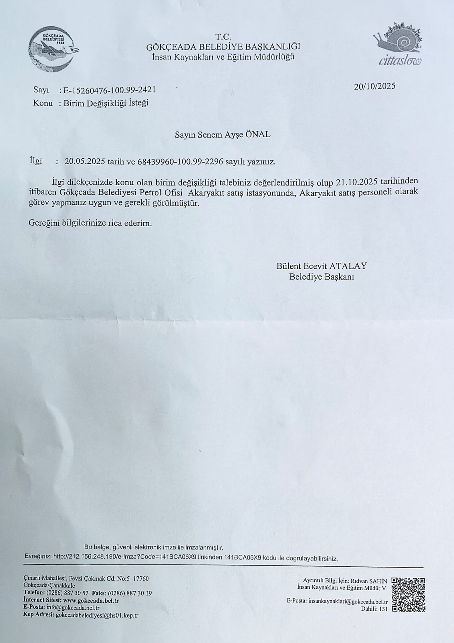 Görev değişikliği adı altında kadın çalışanın sürgün edildiğine yönelik resmi belge: